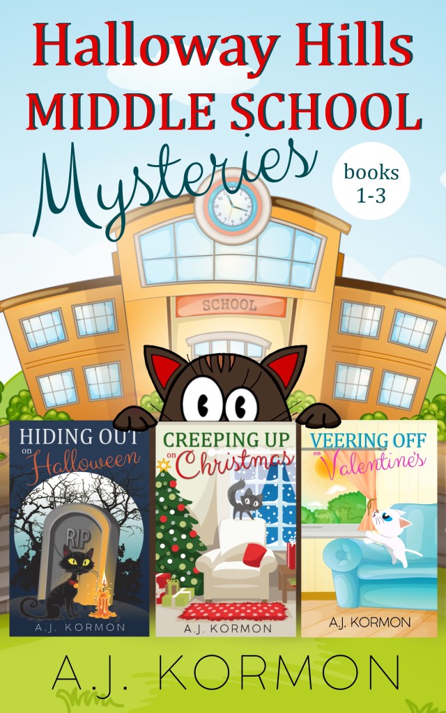 AJ Kormon started out writing books about money to help explain the concept to her kids. As her kids got older, they showed signs of not wanting to read, so she enlisted their help creating a series for resistant readers. This is how the Halloway Hills Middle School Mysteries were born. When AJ isn’t writing and cartooning, you’ll find her losing to her kids at Uno.
